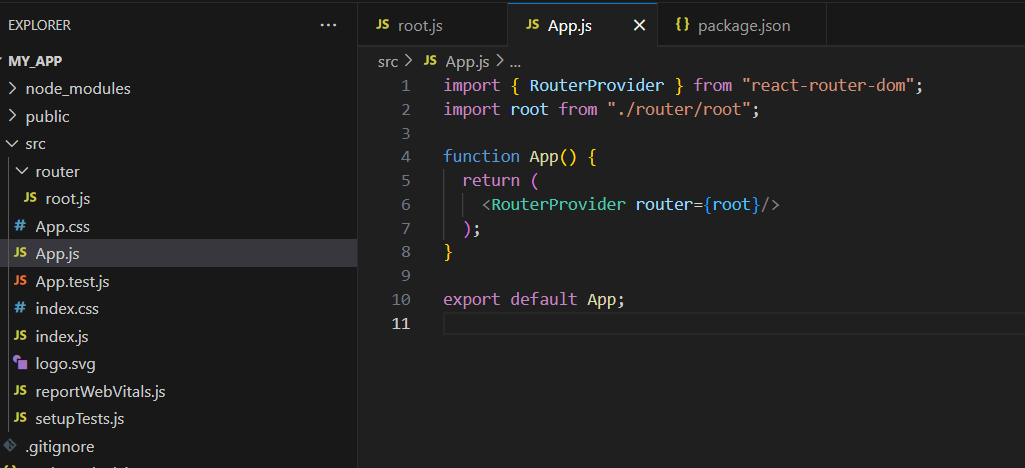 - 프로젝트 내에 router 폴더를 생성하고 root.js 파일에서 기본 라우팅 설정을 추가합니다.