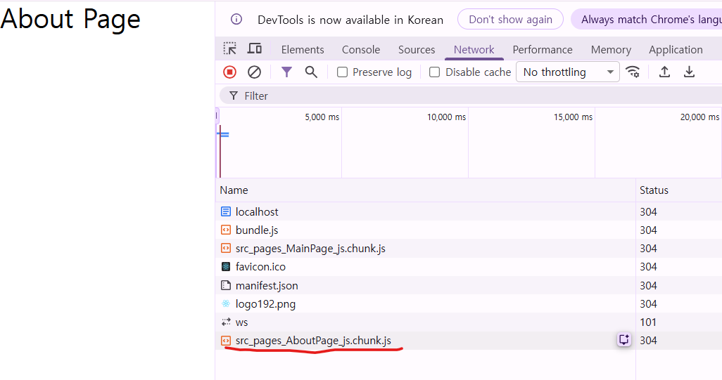 <Link> 로 처리된 'About link'을 클릭하면 AboutPage 컴포넌트만 추가적으로 로딩된다.